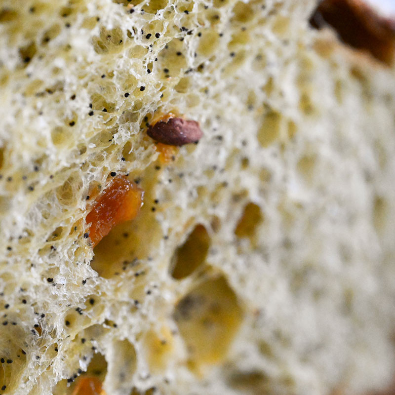 L’impasto soffice e profumato accoglie morbidi cubetti di pesca candita, che donano dolcezza e freschezza, mentre i semi di papavero regalano una nota aromatica elegante e una piacevole texture. La glassa croccante in superficie completa l’equilibrio tra morbidezza e fragranza, esaltando ogni fetta con un contrasto armonioso di sapori e consistenze.